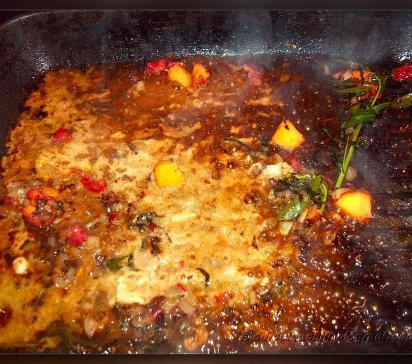 * w tym czasie robimy, rzecz najważniejszą w dzisiejszej potrawie - sos. Na patelni po przełożeniu filetów została sama esencja smaków, kolejno z owoców, czosnku i cebuli, obsmażenia mięsa (marynata) oraz świeżego rozmarynu.* trzymamy patelnię na małym ogniu (widok nie jest może zbyt estetyczny, ale .....smak) pozwalając na zredukowanie się sosu. (3-4 minuty)* całość zalewamy marynatą, i jeszcze chwilę trzymamy na ogniu, sos musi "związać" wszystkie smaki.