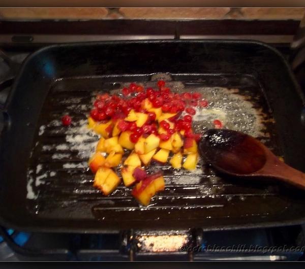 * na patelni grillowej rozpuszczamy masło (1-2 łyżki), dodajemy 1 łyżkę oliwy z oliwek (aby masło nam się nie przypaliło)* wrzucamy na rozgrzane masło, pokrojoną w kostkę brzoskwinię i czerwoną porzeczkę.* całość smażymy na patelni bardzo krótko, (3 - 4 minuty) cały czas delikatnie mieszając owoce drewnianą łyżką. Tak aby, owoce "puściły" nie co soku,* przekładamy na inną patelnię, lub talerzyk, będziemy potrzebowali już na sam koniec, tuż przed podaniem potrawy.