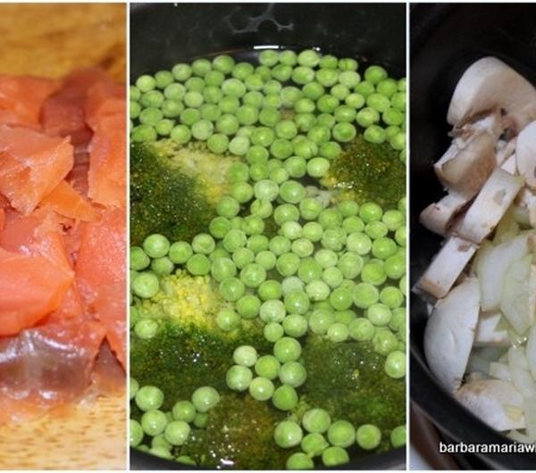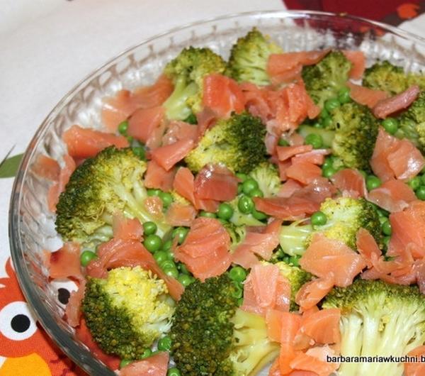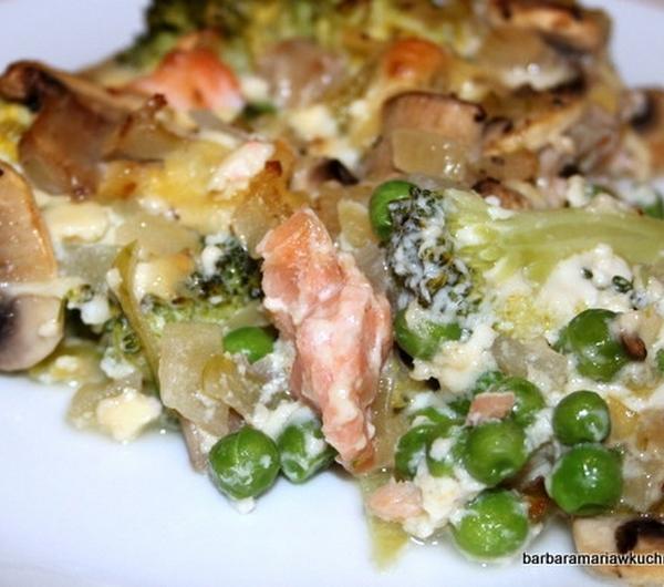 Bardzo smaczne, proste w przygotowaniu danie. Coś dla fanów łososia :) Nie zwlekaj, wypróbuj już dziś. Jeśli masz ochotę, możesz dodać inne warzywa - baw się smakiem. Przepis autorstwa Klary Desser.Składniki: ( 4 porcje)200 g wędzonego łososia400 g brokułów150 g mrożonego groszkumasło do wysmarowania formy100 g pieczarek lub innych grzybów1 cebulamasło do smażeniaMasa jajeczna:4 jaja1 dl sera żółtego3 dl śmietany 36%sól, pieprzSposób przygotowania:Włącz piekarnik na 200°C. Pokrój łososia na małe kawałki. Ugotuj brokuły kilka minut i dodaj mrożony groszek na pół minuty. Odcedź warzywa i polej zimną wodą. Połóż warzywa i łososia w wysmarowanej formie. Umyj pieczarki i pokrój. Pokrój cebulę w kostkę i usmaż na maśle razem z pieczarkami. Dołóż do zapiekanki. Przygotuj masę jajeczną: ubij jaja, dodaj ser, śmietanę i przyprawy. Zalej całość. Zapiekaj około 20 minut, aż ser się zarumieni.
