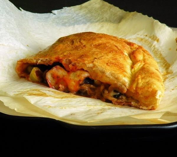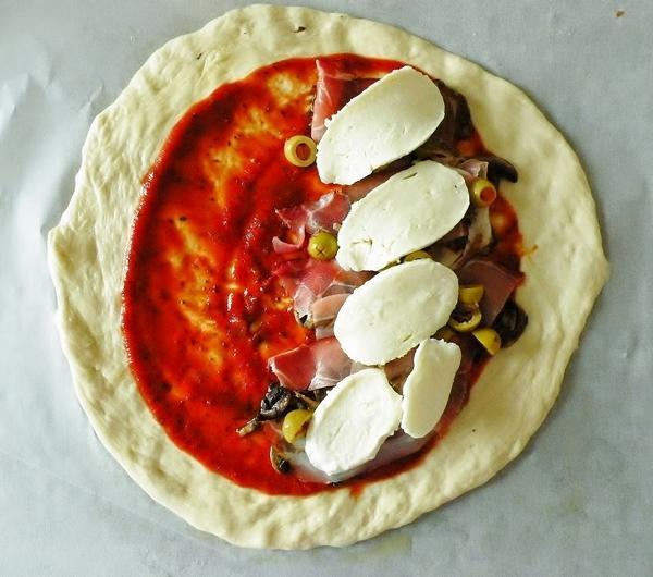 mozzarelli. Drugim przykryć dodatki, zlepić boki, dociskając palcem. Zlepiony bok posypać