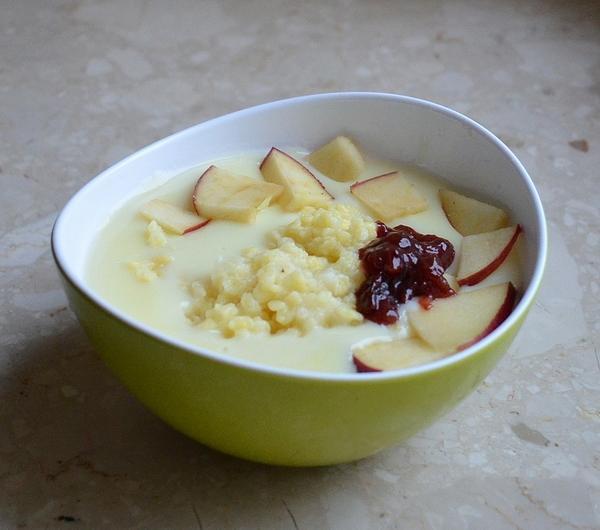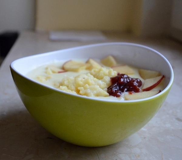 makaron zacierki na budyniu waniliowym z jabłkiem i powidłami śliwkowymipasta with vanilla pudding, apple and homemade plum jam