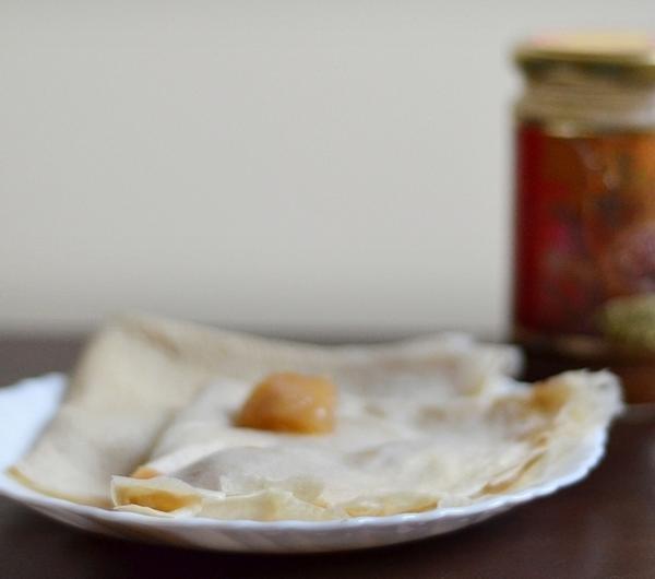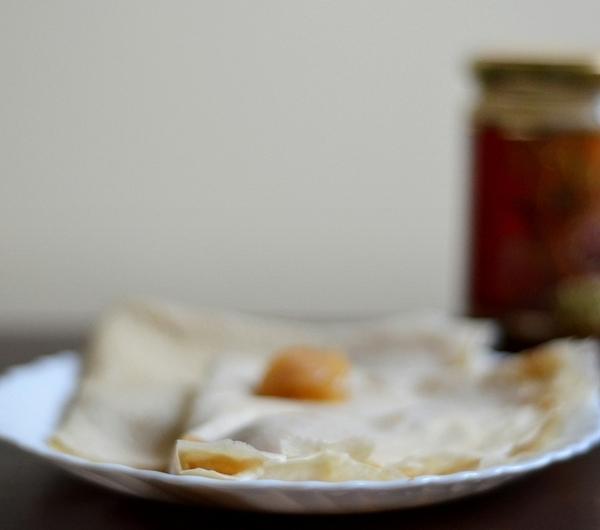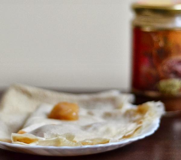 żytnie naleśniki z musem jabłkowo-dyniowym, twarożkiem i kremem chałwowo-daktylowymwholewheat crepes with apple-pumpkin mousse, quark and halvah-date cream