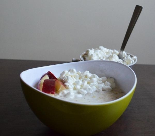 płatki orkiszowe z serkiem wiejskim, jabłkiem i mielonymi migdałamispelt flakes with cottage cheese, apple and almond flour