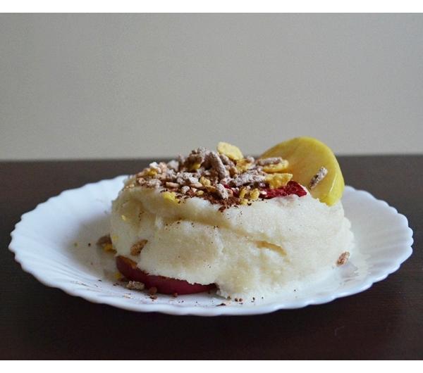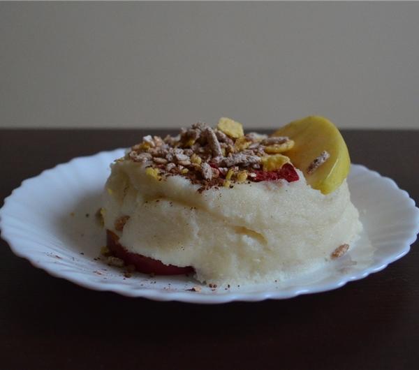 semolina pudding cake with crunchy, muesli, apple and cocoa, coffee