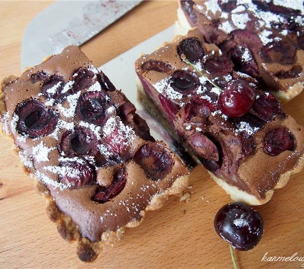 English versionChocolate and cherry tart(13 cmx35 cm, or 26 cm tart tin)Ingredients:125 g unsalted butter, melted and cooled80 g caster sugar, plus 3 tablespoons extra190 g plain