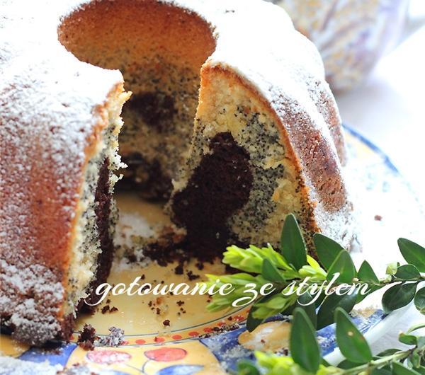 Składniki :200 g margaryny kostkowej (Kasia), ewentualnie masło2 szklanki mąki pszennej5 jajek1 ½ szklanki cukru1 ½ łyżeczki proszku do pieczenia2 łyżki kakao½ szklanki maku8 łyżek stołowych oleju1 opakowanie kisielu truskawkowego lub wiśniowegocukier puder do dekoracjiSposób przygotowania:Białka oddzielić od żółtek, następnie białka ubić na sztywną pianę. Do miski miksera włożyć margarynę, żółtka i cukier, po czym ucierać około 3 minuty. Dodać mąkę wymieszaną z proszkiem do pieczenia oraz olej, ucierać jeszcze przez chwilę aż do uzyskania gładkiej masy. Na koniec dodać ubitą na sztywno piane z białek, delikatnie wymieszać za pomocą drewnianej łyżki.Masę podzielić na 3 części. Do jednej dodać kisiel, do drugie kakao, natomiast do trzeciej ½ szklanki maku, wszystkie masy dokładnie wymieszać.Formę na babkę nasmarować masłem i posypać bułką tartą. Na spód nałożyć masę jasną (z dodatkiem kisielu), następnie masę z makiem a na koniec masę kakaową.Babkę wstawić do piekarnika nagrzanego do 180 stopni, piec od 1 do 1,5 godziny. Po przestudzeniu babkę posypać cukrem pudrem.