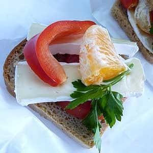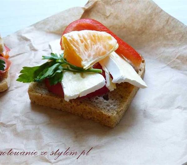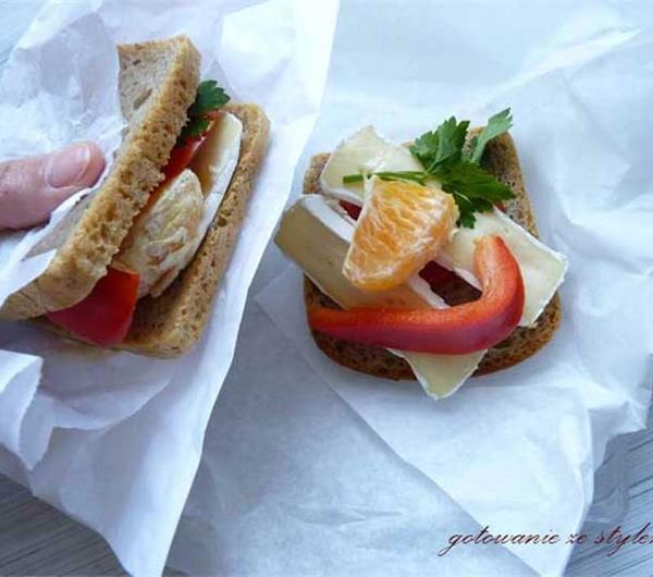Składniki na 2 kanapki:2 kromki chleba dowolnego rodzaju (np. staropolskiego, razowego, żytniego bądź pytlowego)4 plasterki sera pleśniowego Camembertmasło do posmarowania pieczywa2 plastry pomidora2 plastry papryki czerwonej2 kawałki pomarańczynatka pietruszki do dekoracjiSposób przygotowania:Pokrojone pieczywo nasmarować masłem.Serek pleśniowy, pomidor oraz paprykę czerwoną pokroić w plastry.Pomarańczę obrać i oddzielić od niej 2 kawałki.Wszystkie składniki ułożyć kolejno na pieczywie.Kanapki można udekorować natką pietruszki