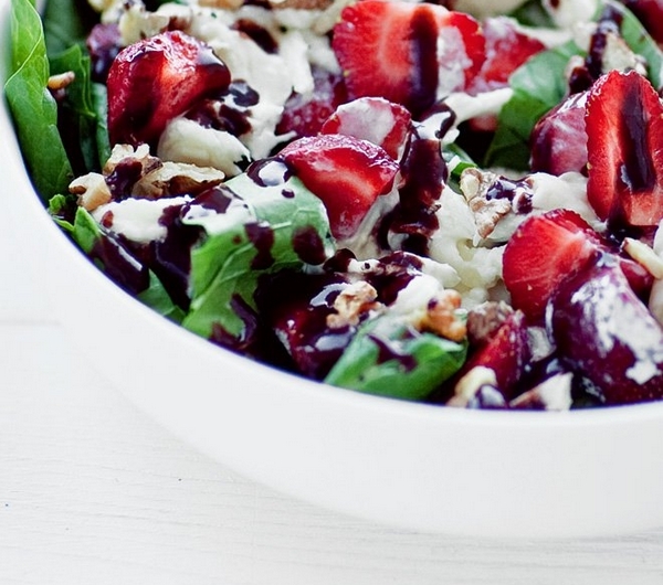 Składniki na 3 porcje:150 g liści szpinaku500 g truskawek1 pełna łyżka stołowa cukru½ łyżeczki cukru pudru125 g mozzarelli w kulce2 łyżeczki miodu30 g orzechów włoskich3 łyżki śmietany kremówki – 30%Sposób przygotowania:Szpinak umyć, odciąć ogonki. Jeśli liście są zbyt długie można posiekać je nożem na mniejsze fragmenty.Truskawki odszypułkować, umyć i osuszyć a następnie pokroić na połówki. Wymieszać z cukrem i odstawić.Orzechy posiekać na drobno, wymieszać z miodem i uprażyć na patelni.Mozzarellę rozdrobnić rękoma na kawałki. Śmietanę wymieszać z cukrem pudrem.Na talerzu układać szpinak. Na nim umieścić truskawki. Posypać uprażonymi orzechami włoskimi i kawałkami mozzarelli oraz polać śmietaną.Moje rady:Sałatka świetnie smakuje także w połączeniu z sosem z konfitury truskawkowej. Wystarczy 2 łyżki konfitury truskawkowej wymieszać z 1 łyżeczką octu balsamicznego oraz 1 łyżeczką oliwy z oliwek i polać sałatkę.