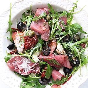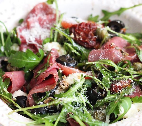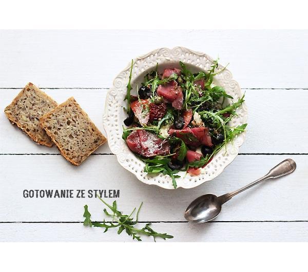 Składniki na 2 porcje:6 plastrów szynki parmeńskiej - prosciutto (ja użyłam carne equina frachetti)1/2 paczki rukoli6 plastrów suszonych pomidorów z zalewy1/2 kulki mozzarelli1 łyżka stołowa kaparów10 czarnych oliwek bez pestek1 świeży pomidor1 łyżka startego na drobno parmezanu (ja użyłam Grana Padano)Dressing:2 łyżki oliwy extra virgine1/2 łyżeczki octu balsamicznego1 łyżka soku z cytryny1 ząbek czosnku1 łyżeczka ziół prowansalskich1 łyżeczka oreganoSposób przygotowania:Do naczynia przełożyć umytą rukolę.Dodać pokrojone w kostkę suszone pomidory.Szynkę prosciutto oraz mozzarellę porwać na kawałki.Oliwki pokroić każdą na 4 części. Następnie dodać kapary oraz pokrojonego na kilka części świeżego pomidora.Dressing:Czosnek przecisnąć przez praskę, dodać oliwę, ocet, sok z cytryny oraz zioła prowansalskie i oregano. Całość dokładnie wymieszać i polać sałatkę.Sałatkę wstawić do lodówki naokoło 20 - 30 minut, aby smaki się przegryzły.