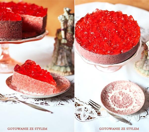 Składniki :1 mały kubeczek masła roślinnego1 kg truskawek2 żółtka1 łyżka spirytusu2 łyżki stołowe żelatyny1 galaretka truskawkowatortownica tradycyjna dużaSposób przygotowania:Umyte i oczyszczone truskawki miksujemy ze spirytusem.W oddzielnym naczyniu ucieramy masło z cukrem i żółtkami. do utartego masła stopniowo dodajemy zmiksowane truskawki. Na koniec wlewamy rozpuszczoną lekko ciepłą żelatynę.Wszystko przelewamy do tortownicy.Gdy torcik lekko stężeje, dekorujemy go truskawkami i zalewamy zimną galaretką. Wstawiamy na noc do lodówki.
