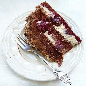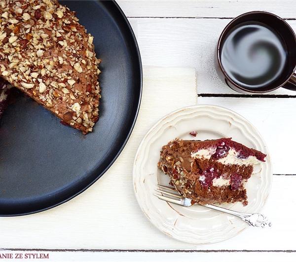 Składniki :Biszkopt kakaowy:4 całe jajka1 szklanka cukru¾ szklanki mąki tortowej1 łyżka stołowa mąki ziemniaczanej1½ łyżeczki proszku do pieczenia2 pełne łyżki kakaoKrem:400 g chałwy waniliowej100 g masła250 g sera ricotta, może być także mascarpone2 łyżki cukruDodatkowo:1 szklanka wiśni mrożonych bądź świeżych8 łyżek cukru150 g czekolady gorzkiej200 g śmietany kremówki 30%100 g orzechów laskowychDo nasączenia:1 szklanka zaparzonej mocnej esencji herbaty½ szklanki zblenderowanych wiśniSposób przygotowania:Biszkopt kakaowy:Jajka ubić z cukrem za pomocą miksera na puszystą masę.Mąkę przesiać do miseczki wraz z mąką ziemniaczaną, proszkiem do pieczenia oraz kakao.Suche składniki stopniowo dodawać do ubitej masy jajecznej cały czas mieszając za pomocą łyżki.Tortownicę nasmarować masłem oraz posypać mąką. Przelać ciasto biszkoptowe, wstawić do piekarnika i piec około 20 minut w temperaturze 180 °C. Po upieczeniu biszkopt pozostawić w zamkniętym piekarniku na około 10 minut, po tym czasie uchylić drzwiczki i pozostawić ciasto do całkowitego przestygnięcia.Krem:Do miseczki przełożyć masło, ricottę, cukier oraz pokruszoną chałwę, po czym ucierać za pomocą miksera, aż do uzyskania gładkiej masy. Odstawić do lodówki.Wykończenie:Szklankę wiśni zasypać 6 łyżkami cukru. Pozostałą ilość zblenderować w oddzielnym naczyniu na gładką masę.Orzechy laskowe posiekać niezbyt drobno.Przygotowanie masy śmietanowo - czekoladowej: czekoladę umieścić w żaroodpornej misce, ustawić nad rondlem z gotującą się wodą i podgrzewać, aż do całkowitego rozpuszczenia się, następnie przestudzić. Śmietanę ubić na sztywno z 2 łyżkami cukru, dodać rozpuszczoną i przestudzoną czekoladę i wymieszać na zmniejszonych obrotach miksera, po czym wstawić do lodówki.Przestudzony biszkopt przekroić wzdłuż w dwóch miejscach. Spodnią warstwę nasączać 5 łyżkami zimnej herbaty oraz4 łyżkami zblenderowanych wiśni, następnie ułożyć ½ szklanki całych wiśni, nałożyć krem i przykryć kolejną warstwą ciasta. Podobnie uczynić z warstwą środkową.Wierzchnią warstwę biszkoptu delikatnie ściąć nożem i nasączyć herbatą. Cały biszkopt pokryć masą czekoladową i obsypać posiekanymi orzechami laskowymi.Wstawić do lodówki na minimum 2-3 godziny.