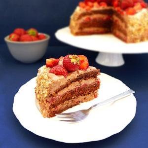Składniki :Biszkopt:4 duże jajka, rozmiar L1 szklanka cukru2 pełne łyżki stołowe kakao1 szklanka mąki tortowej1 łyżka stołowa mąki ziemniaczanej1/2 łyżeczki proszku do pieczeniaKrem:250 g serka mascarpone300 ml śmietany kremówki – 30% bądź 36%100 g czekolady gorzkiej o zawartości masy kakaowej – 70%1/2 szklanki cukru pudruDo nasączenia:1/2 szklanki zaparzonej mocnej esencji herbaty1 łyżeczka cukru wanilinowegoDodatkowo:600 g truskawek do ciasta + 400 g do dekoracji1 1/2 szklanki truskawek zmiksować wraz z 4 łyżkami cukru na mus. Pozostałą część pokroić w plastry.Truskawki do dekoracji pokroić natomiast na połówki.Posypka:30 g posiekanych na drobno orzechów włoskich4 łyżki płatków owsianych górskich3 łyżki cukru brązowegoWszystkie składniki przełożyć do robota kuchennego bądź blendera i rozdrobnić.Sposób przygotowania:Krem:Czekoladę stopić w żaroodpornej misce umieszczonej nad rondlem z gotującą się wodą, po czym lekko ją przestudzić. Gęstą śmietanę ubić na sztywno, następnie domieszać cukier puder, mascarpone oraz rozpuszczoną czekoladę. Włożyć do lodówki.Biszkopt czekoladowy:Całe jajka utrzeć wraz z cukrem na puszystą i lekką masę.Mąkę tortową, ziemniaczaną, proszek do pieczenia oraz kakao przesiać do miski i delikatnie wymieszać. Suche składniki dodawać stopniowo do masy jajecznej delikatnie mieszając za pomocą łyżki bądź na zmniejszonych obrotach miksera.Tortownicę o średnicy 21 cm wysmarować masłem bądź wyłożyć pergaminem. Przelać do niej masę, wyrównać delikatnie powierzchnię i piec 20 minut w piekarniku rozgrzanym do temperatury 170°C (u mnie bez termoobiegu góra dół). Wyjąć z piekarnika i wystudzić.Wykończenie:Z powierzchni wystudzonego ciasta odciąć i wyrzucić cienką przypieczoną warstwę, po czym przekroić tort poziomo na 3 części. Pierwszy krążek ciasta położyć na paterze, nasączyć kilkoma łyżeczkami herbaty, a następnie ułożyć na całej powierzchni plastry truskawek, zalać 1/2 sosu truskawkowego oraz posmarować 1/4 ilości kremu. Przykryć drugim krążkiem, po czym powtórzyć poprzednią czynność. Umieścić ostatni krążek i nasączyć go herbatą. Resztą kremu rozsmarować równomiernie na wierzch i boki ciasta.Boki ciasta posypać zmielonymi orzechami włoskimi i płatkami owsianymi. Wstawić do lodówki na minimum 2 godziny. Przed podaniem wierzch ciasta udekorować pokrojonymi na połówki truskawki.