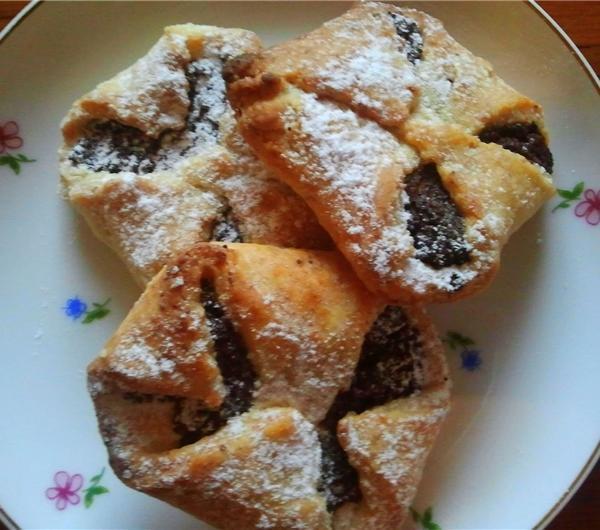 Zachwyciłam się ostatnio serowymi rożkami. Ze strucli zostało mi trochę maku, wykorzystałam go więc jako nadzienie do serowych ciastek. O zasadzie robienia ciasta serowego pisałam przy okazji rożków tutaj .A teraz przypomnienie i wersja z makiem i bakaliami.Składniki na ciasto:25 dag mąki25 dag masła25 dag sera białego1 łyżka cukru pudruZe wszystkich składników zagnieść ciasto, wykrawać kwadraty.Składniki na masę makową:100 g maku mielonegobakalie (orzechy, rodzynki, daktyle, figi, skórki cytrusowe)1 białko2 łyżki cukrułyżeczka masłałyżka mioduolejek migdałowy150 ml mlekaMak ugotować w mleku, ostudzić. Dodać bakalie, miód,aromat, cukier i roztopione masło. Z białka ubić pianę i delikatnie wymieszać z makiem. Kłaść po łyżeczce masy na kwadraty z ciasta. Zlepiać rogi po przekątnej.Piec na papierze do zrumienienia w 180*C. Po ostudzeniu można posypać cukrem pudrem
