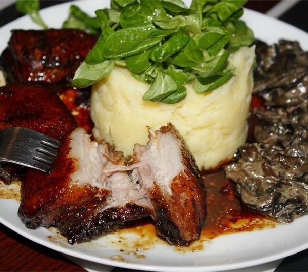 Wszystkie przyprawy i sosy ,mieszamy ze sobą , dodajemy miód , mieszamy . Boczek tniemy w ładne , zgrabne kwadraty , osuszamy je ręcznikiem papierowym . Mięso przekładamy do miski lub pojemnika i zalewamy marynatą – wmasowujemy ją w każdy kawałek . Odstawiamy , koniecznie na całą noc . Następnego dnia , układamy na blaszce do pieczenia , dociskając od góry drugą blaszką , najlepiej wypełnioną woda ,żeby zwiększyć jej docisk . Boczek musi być sprasowany , gdyż w ten sposób uzyskamy idealne kwadratowe kostki – bardzo soczyste i równiutkie . Oczywiście jak nie dociśniecie go niczym , też wyjdzie smaczny , tylko się powywija w trakcie pieczenia 😉 Wkładamy ostrożnie całość do nagrzanego do 150 C piekarnika i pieczemy bez termoobiegu około 1,5 godziny . Po tym czasie zdejmujemy wierzchnią blaszkę i pozwalamy przez 20-30 minut wytworzyć piękną skorupkę na wierzchu boczku . W trakcie pieczenia , jeżeli zajdzie taka potrzeba , bo boczek nie puści soku , można go delikatnie podlać wodą , ale dosłownie tylko tyle ,żeby się nie przypalał ( około 50-100 ml ) . . Serwujemy na gorąco , idealnie smakuje z leśnymi grzybami , ale równie dobra będzie kiszona kapusta 😉