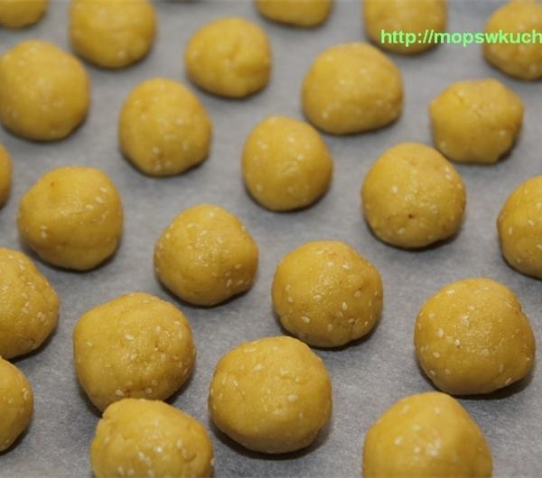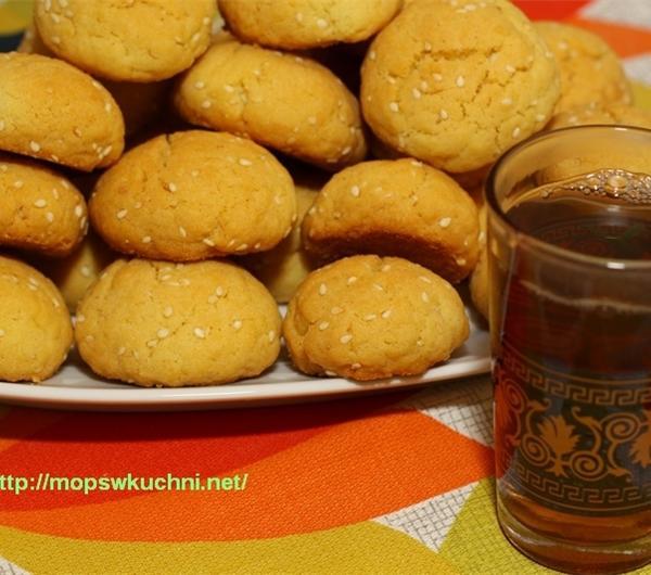Składniki:500 g mąki100 g cukru pudru2 łyżki sezamuszczypta soli10 łyżek oliwy z oliwek15 łyżek roztopionej margaryny (zamiast masła)1 łyżeczka proszku do pieczenia2 jajka (w przepisie nie było)Do składników podanych na stronie dodałam jeszcze 2 jajka, albowiem podczas wyrabiania składniki ciasta nie chciały się połączyć. Co prawda nie zostawiłam ciasta na noc w lodówce jak było napisane na smaker.pl, nie miałam zwyczajnie na to czasu. Ciasteczka robiłam w dniu wieczorku marokańskiego. Być może przez noc składniki ciasta by się połączyły. Roztopiłam zatem 3/4 paczki margaryny. Uprażyłam na patelni teflonowej ziarna sezamy. Wszystko wystudziłam. Zagniotłam mąkę z solą, proszkiem do pieczenia, cukrem, oliwą i margaryną. Na końcu dodałam sezam i jajka. Wstawiłam ciasto na 30 minut do lodówki.Blachę do pieczenia wykładamy papierem. Z ciasta formujemy kulki wielkości orzecha włoskiego. Układamy na blasze w odstępach około 3 cm, albowiem ciasteczka nieco urosną.