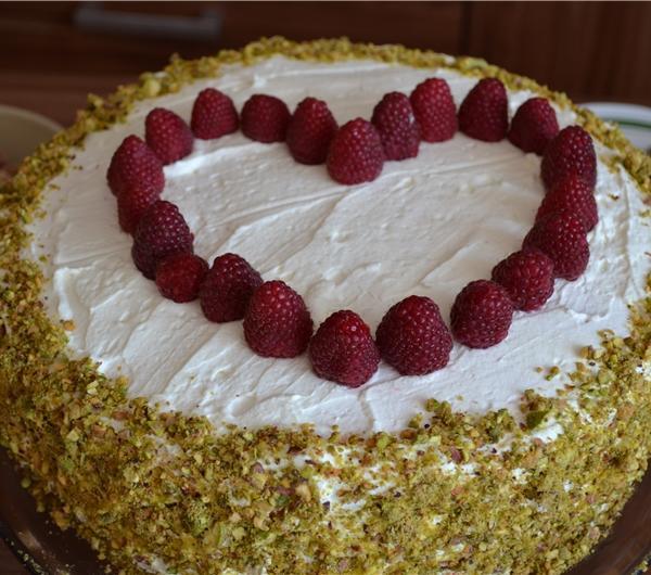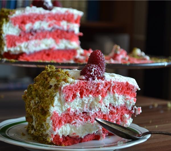 Składniki na tortownice 28-30 cm:Biszkopt:– 10 jajek;– 3/4 szklanki cukru;– 1,3 szklanki mąki pszennej tortowej;– 1/2 szklanki mąki ziemniaczanej;– 1 łyżeczka czerwonego barwika spożywczego w proszku;Przełożenie i dekoracja:– 10 łyżek konfitury malinowej (mały słoik)– 3 łyżki syropu malinowego;– 1 l śmietany kremówki mocno schłodzonej (ja użyłam 36%, bo jest trwała)– 3 łyżki cukru pudru;– 250 g pistacji;– maliny;Wykonanie:Piekarnik nagrzać do 170 stopni. Żółtka oddzielić od białek. Białka ubijać mikserem na średnich obrotach przez około 4 minuty aż dobrze się spienią, ale nie będą idealnie sztywne. Stopniowo zwiększać obroty miksera aż do maksymalnych i dodawać cukier cały czas ubijając. Gdy skończy się cukier, ubijać jeszcze pianę na najwyższych obrotach miksera przez około 2 – 3 minuty aż będzie bardzo sztywna i błyszcząca.Następnie dodawać stopniowo po jednym żółtku, cały czas miksując po każdym dodanym. Na koniec dodać barwik spożywczy i zmiksować na małych obrotach miksera do całkowitego rozprowadzenia barwnika w masie.Obydwie mąki przesiać do jednej miski. Do ubitej piany dodać około 1/3 część mąki i miksować na najniższych obrotach miksera przez kilka sekund, dodać drugą porcję mąki i znów króciutko zmiksować, dodać ostatnią porcję mąki i zmiksować tylko do połączenia się składników (w masie nie mogą pozostać grudki mąki).Masę wyłożyć do tortownicy, wyrównać wierzch i wstawić do piekarnika. Piec przez około 35 minut do suchego patyczka. Od razu wyjąć biszkopt z piekarnika, ustawić na metalowej kratce. Po 10 minutach odwrócić formę z biszkoptem do góry dnem i w takiej pozycji położyć na blat lub deskę wyłożoną kawałkiem papieru do pieczenia. Pozostawić do ostudzenia, na około godzinę.Przygotować pistacje: obrać z łupinek a następnie drobno posiekać.Konfiturę malinową włożyć do rondelka razem z syropem malinowym i zagotować. Odstawić z ognia.Bardzo zimną śmietankę ubić na sztywną pianę razem z cukrem pudrem.Ostudzony biszkopt przekroić w poprzek na 3 części. Pierwszy dolny blat położyć na tortownicy, skropić połową przygotowanej konfitury oraz 1/3 bitej śmietany. Położyć drugi blat, skropić resztą konfitury i 1/3 śmietany. Położyć ostatni górny blat biszkoptu, wierzch i boki obłożyć resztą śmietany. Boki obsypać posiekanymi pistacjami. Górę tortu ozdobić malinami. Wstawić do lodówki do czasu podania. Tort będzie już gotowy po godzinie.Nasz tort wyglądał tak: