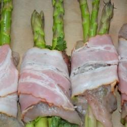 Składniki:4 polędwiczki z kurczaka4 cienkie plastry boczku parzonego12 zielonych szparagów1 garść porwanych liści jarmużusól , pieprzPrzygotowanie:Polędwiczki umyć , osuszyć , rozbić cienko uważając by nie podziurawić mięsa.Oprószyć solą i pieprzem.Szparagi umyć ,osuszyć , odciąć lub oderwać zdrewniałe końce.Na każdą polędwiczkę ułożyć liście jarmużu oraz 3 szparagi.Zawinąć w roladę , owinąć mięso plastrem boczku.Ułożyć w naczyniu wyłożonym papierem do pieczenia , piec 20 min w piekarniku nagrzanym do 180st.