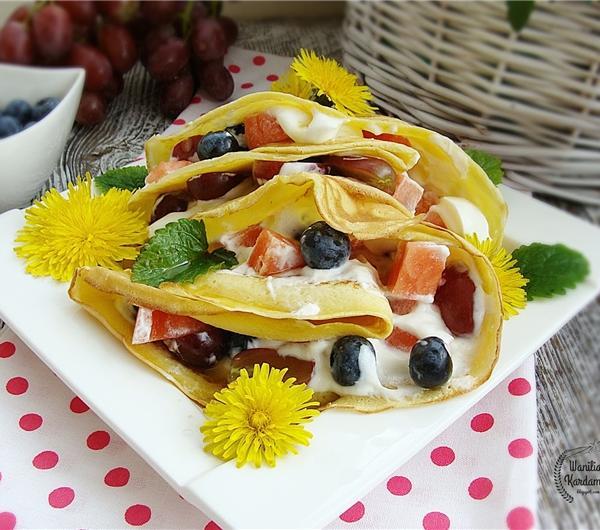 owoców, nakładać nadzienie na usmażone naleśniki zwijać w kopert, układać na talerzu, udekorować