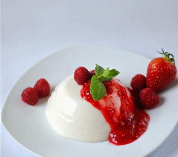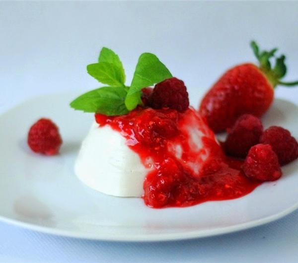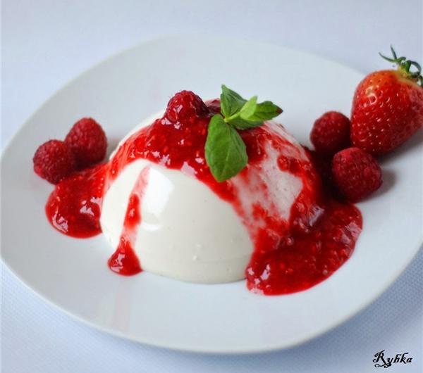 Troszkę zmieniona wersja włoskiego deseru.Chociaż wersji jest sporoSkładniki (na 3 porcje):~200ml mleka~150g mascarpone~150g jogurtu naturalnego gęstego~4 łyżeczki żelatyny~100 ml wrzątku~cukier wanilinowy~szczypta cynamonu~2 łyżeczki brązowego cukru~garść malin +duża truskawka~6-7 suszonych żurawinWykonanie:Do rondelka wlać mleko, dosypać cukry i cynamonpodgrzewać do rozpuszczenia,W tym samym czasie rozpuścić żelatynę we wrzątku.Poczekać aż ostygną, należy jednak uważać by żelatyna nie stężała!Do mleka dodać pokrojoną w kosteczkę żurawinę, żelatynę, jogurt oraz mascarpone- intensywnie mieszając do uzyskania aksamitnej masyPrzelać do miseczek i włożyć do lodówki aż stężeje całość.Polać przetartymi owocami i ozdobić miętą :)zamiast owoców można polać karmelem lub każdym innym dowolnym sosem