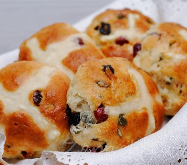 Sposób przygotowania:Mleko podgrzej. W misce wymieszaj 450g mąki, szczyptę soli i pokrojone w małe kawałeczki zimne masło. Dodaj drożdże i przyprawy oraz 50g cukru. Dodaj ciepłe mleko, jajka i dokładnie wymieszaj. Zagniataj 10 minut, a następnie przykryj i odstaw w ciepłe miesjce na godzinę.Ciasto przełóż na stolnicę i rozwałkuj. Wysyp na nie mieszankę keksową i zagnieć tak, aby owoce równomiernie były rozłożone w cieście. Podziel je na 12 bułeczek i uformuj kulki.Powstałe bułeczki ułóż na wysypanej mąką blaszce, przykryj ściereczkę i odsatw jeszcze na 30 minut.Na wyrośnięte bułki przed samym pieczeniem wyciśnij pastę otrzymaną z 100g mąki, 35g oleju i 80g wody (najlepiej przełóż ją do woreczka, odetnij czubek i wyciskaj jak z rękawa cukierniczego). Z pasty formuj krzyż.Wstaw do nagrzanego do 180 st. piekarnika i piecz 15 minut. W ty czasie przygotuj syrop z 1/2 szkl. wody i 8 łyżek cukru - składniki wymieszaj i zagotuj.Gorące bułeczki posmaruj syropem i odstaw do wystygnięcia - chyba, że nie możesz sie oprzeć :)