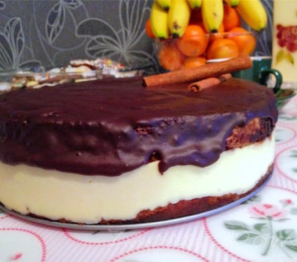 Sposób przygotowania:Trzy białka ubij na sztywno. Pod koniec ubijania dodaj 1/2 szkl. cukru, 3 żółtka, mąkę ziemniaczaną i pszenną, kakao, proszek do pieczenia i przyprawę. Powstałą masę wylej na wyłożoną papierem do pieczenia tortownicę. Piecz do suchego patyczka w temp. 180 st. - ok. 30-40 minut. Pozostaw do ostygnięcia.Ser przełóż do garnka, dodaj masło, 1 szkl. cukru, 3 jaja, cukier waniliowy. Dokładnie zmiksuj. Zacznij podgrzewać na małym ogniu, aż masa będzie rzadka - trwa to ok. 10 minut. Powoli dodawaj budyń ciągle mieszając. Gdy pojawią się bąbelki, zestaw z ognia.Na przecięty spód biszkoptowy znajdujący się w tortownicy wylej ciepłą masę serową. Przykryj drugą częścią spodu. Ostudź.Śmietanę kremówkę podgrzej w małym garnuszku. Zdejmij z palnika i dodaj posiekaną czekoladę. Odstaw na 2 minuty i wymieszaj - czekolada powinna się rozpuśić i otrzymasz gładką polewę. Polej nią ostudzony sernik i wstaw do lodówki.