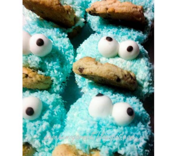 Me want cookie!Kto nie uśmiecha się na myśl o Ciasteczkowym Potworze?Patrząc na poniższe muffiny także ciężko powstrzymać się od uśmiechu…Bo co może być słodszego niż Ciasteczkowy Potwór w postaci muffinki?Muffiny składają się z ciasta bazy (którą może być praktycznie każde ciasto na muffiny), kremu oraz rzeczy najważniejszej – atrybutów Ciasteczkowego Potwora (lukrowych oczu, czekoladowego ciasteczka oraz niebieskiego futerka (w postaci wiórków kokosowych ;))PrzepisBaza muffinkowa (w moim przypadku z białą czekoladą) (12 sztuk):200g białej czekolady,2 łyżki śmietanki kremówki,150g miękkiego masła,50g cukru,3 jajka,90g maki pszennej,50g czekolady mlecznej,szczypta soli,1/2 łyżeczki proszku do pieczenia,1/2 łyżeczki ekstraktu waniliowego.Białą czekoladę połamać na mniejsze kawałki i rozpuścić w kąpieli wodnej lub w mikrofalówce (wykorzystałam drugą opcje, 200g rozpuściło się w ok. 2min). W tym czasie ublić masło z cukrem na białą puszystą masę. Po rozpuszczeniu cukru dodawać po jednym jajku, miksując na bardzo małych obrotach. Do białej czekolady dodać śmietankę. Wmieszać czekoladę do masy jajeczno-maślanej (najlepiej łyżką, tylko do połączenia składników) dodać ekstrakt waniliowy.Mąkę wymieszać z proszkiem do pieczenia oraz z solą. Przesiać do miski z masą i wymieszać. Czekoladę mleczną posiekać i dodać do ciasta mieszając łyżką. Przy pomocy łyżki rozłożyć masę do foremki na 12 muffinów mniej więcej na wysokość całej papilotki (masa urośnie nieznacznie).Piec ok. 10 minut w temperaturze 180°C, aż do zezłocenia. Studzić na kratce.Krem250g serka mascaropne,100g śmietanki kremówki,2 łyżki cukru pudru.Śmietankę ubić na sztywno, pod koniec ubijania dodać cukier puder. Po zaprzestaniu miksowania wmieszać łyżką serek mascarpone.Ozdabianie100g białego lukru plastycznego,50g gorzkiej czekolady,6 ciasteczek z czekoladą,100g wiórków kokosowych,kilka łyżek Curacao (w ramach niebieskiego barwnika).Część wiórków kokosowych wymieszać w głębokim talerzu z Curacao. Odstawić żeby wchłonęły wilgoć. Resztę wiórków wmieszać później, daje to daje to fajny niebiesko-biały efekt futerka.Z lukru plastycznego uformować 12 par oczu, jedno oko średnicy ok. 1,5cm. Oczy mogą różnić się wielkością, kształtem czy umiejscowieniem źrenicy – im dziwniej ułożone tym śmieszniej później Cookie Monster wygląda :)Czekoladę rozpuścić, a następnie za pomocą wykałaczki bądź pałeczki do chińszczyzny (mój wybór :)) robić duże źrenice na lukrowych kulkach.Ciasteczka przekroić na pół.Na każdą babeczkę nałożyć 1-2 łyżki kremu, obsypać wiórkami. Ułożyć oczy i poniżej oczu zrobić nacięcie nożem do 3/4 głębokości babeczki, w które włożyć połowę ciasteczka.Czerwona owca ;)Desery Muffiny i babeczki PrzepisyTagiMuffinyAutorAnna SudołZ zawodu informatyk, z serca kucharz. Wegetarianka i wyznawczyni absolutnej relaksacji kuchennej. Twardy charakterek łagodzi i rekompensuje ludziom smacznym jedzeniem. Wiecznie w kuchni, wiecznie coś kombinuje. Chciałaby zostać sama sobie szefem i stworzyć coś co zapadnie wszystkim w pamięć.Poprzedni wpisKrem z marchewkiNastępny wpisPavlovaMuffiny brownie z beząOstatnio zostałam wielką fanką bezy, pasuje mi do [...] Czytaj dalej +Tarta z białą czekoladą i mascarponePolecam wszystkim uwielbiającym słodycz białej cze [...] Czytaj dalej +Najlepsze czekoladowe muffinyPo internecie krąży wiele przepisów na czekoladowe [...] Czytaj dalej +Ciasteczka czekoladowe / Outrageous Chocolate CookiesSkandalicznie czekoladowe ciasteczka według przepi [...] Czytaj dalej +