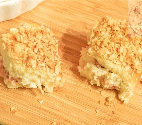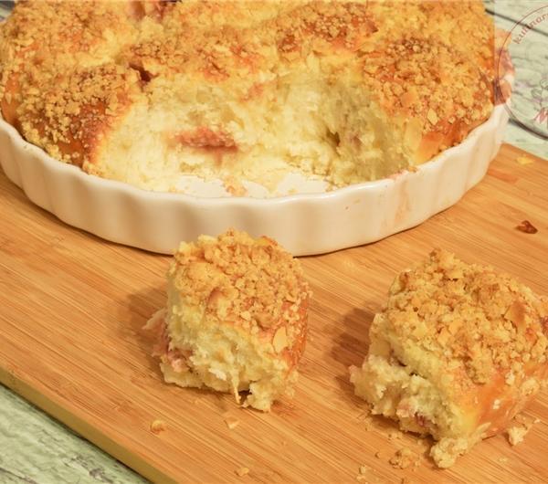 Twarożek mieszamy z jajkiem, cukrem z wanilią. Przygotowujemy kruszonkę - składniki mieszamy ze sobą palcami. Nasze ciasto dzielimy na 14 części, robimy kulki i możemy je rozwałkować, ja po prostu rozgniotłam je palcami na kształt koła. Na każdą część nakładamy po łyżeczce twarożku i dżemu i zamykamy tworząc kulki. Układamy je w naczyniu okrągłym, u mnie forma do tarty, smarujemy rozbełtanym jakiem i posypujemy kruszonką. Wstawiamy do nagrzanego piekarnika do 180 stopni i pieczemy, aż się ładnie zarumienią około 30 minut. Wyciągamy i odstawiamy do przestudzenia, odrywamy bułki i jemy ze smakiem.