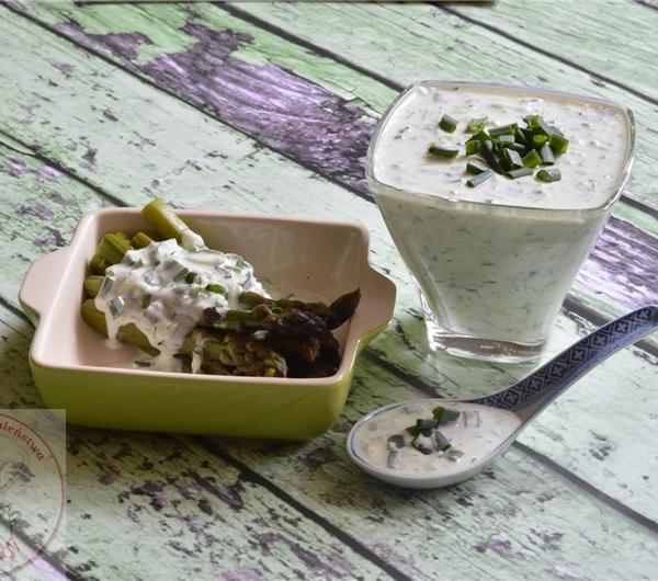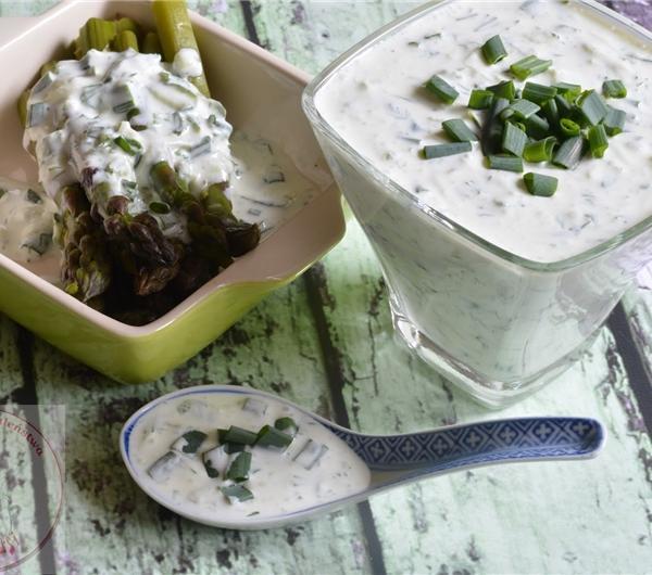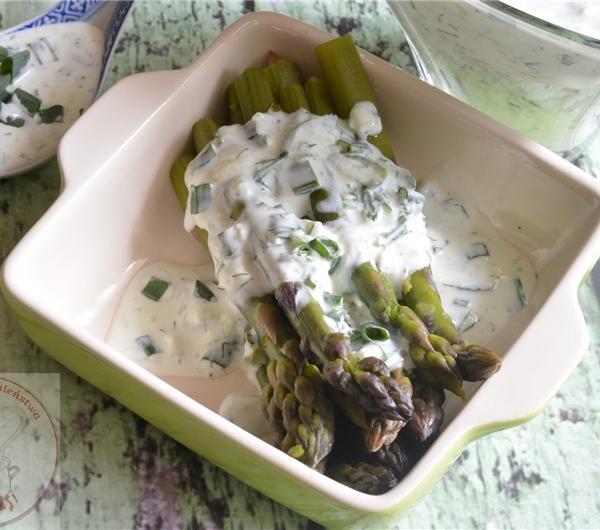 Kolejny pomysł na szparagi. Szybko i smacznie. Dzisiaj zobaczyłam w zaprzyjaźnionym warzywniaku świetne szparagi, takie cienkie. Najbardziej takie lubię. Kupiłam całe dwa pęczki i biegiem do domu. Na początku chciałam je podać po prostu z bułką tartą, ale pomyślałam o sosie czosnkowym. No i wykombinowałam takie danie. Zjedliśmy szparagi z sosem czosnkowym i z kawałkiem bagietki. Było pysznie.Zapraszam do spróbowania :-)Składniki:- 2 pęczki zielonych szparagów- duży jogurt naturalny grecki- 2-3 ząbki czosnku- kilka gałązek koperku- kilka gałązek natki pietruszki- kilka gałązek szczypiorku- kilka listków świeżej bazylii- sól himalajska- 1 zielony ogórek długi- świeżo zmielony pieprz- pół łyżeczki musztardy- pół łyżeczki mioduWykonanie:Przygotowujemy szparagi - odłamujemy zdrewniałe końce i gotujemy (ja tym razem ugotowałam je w parowarze). Do miski wrzucamy jogurt, miód i musztardę, mieszamy. Dodajemy posiekane zioła (pietruszkę, bazylię, szczypior i koperek), wyciśnięte ząbki czosnku i starty na tarce ogórek (na dużych oczkach). Mieszamy i doprawiamy jeszcze solą i pieprzem. Szparagi układamy na talerzach, w miseczkach i polewamy sosem. Możemy podać z bagietką, ziemniakami.