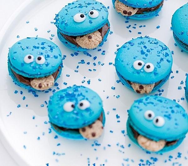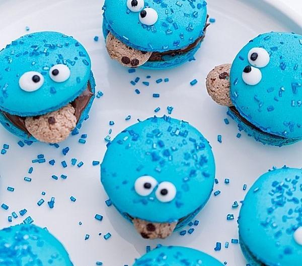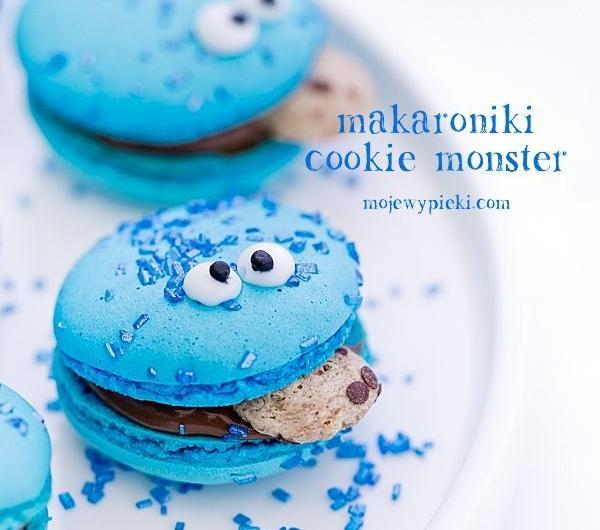 Makaroniki Cookie Monster, na Dzień Dziecka :-). Słynne makaronikowe ciasteczka dla dzieci i dla tych, którzy dziećmi wciąż się czują :-). Zgodnie z gustem maluchów przełożone nutellą (można skorzystać z przepisu na domową nutellę). Idealne na dziecięce party tematyczne. Miłego świętowania!Składniki na około 30 ciastek (lub około 40 mini - makaroników):150 g zmielonych migdałów150 g cukru pudru120 g białek (podzielone na 60 g + 60 g), w temperaturze pokojowej185 g cukru (podzielone na 150 g + 35 g)50 ml wodybarwnik w paście/żelu - użyłam barwnika Wilton w kubeczku (kolor sky blue - błękit nieba)Migdały i cukier puder umieścić w malakserze. Zmiksować do połączenia, przez około 2 minuty. Przesiać przez bardzo drobne sitko do większego naczynia usuwając wszelkie większe kawałki migdałów (w to miejsce dosypać nowych, drobniejszych, zazwyczaj jest to około 1 łyżeczki). Dodać 60 g białek, dokładnie wymieszać. Dodać dowolną ilość barwnika, wymieszać (uwaga: barwa powinna być intensywna, białka dodawane później rozrzedzą kolor).W misie miksera umieścić dodatkowe 60 g białek (misa powinna być sucha, bez śladów tłuszczu, białka idealnie oddzielone od żółtek). Obok w małym kubeczku przygotować 35 g cukru.W małym garnuszku umieścić 150 g cukru i 50 ml wody. Wymieszać, zagotować. W garnuszku umieścić termometr cukierniczy i gotować na średniej mocy palnika (ważne: nie mieszając ani razu!) do osiągnięcia na nim temperatury 118ºC (245ºF).W międzyczasie, gdy syrop dochodzi do temperatury 100ºC (210ºF) zacząć ubijać białka. Białka ubijać jak na bezy - do sztywności, pod koniec miksowania dosypując cukier, łyżeczka po łyżeczce, cały czas miksując. Gdy syrop osiągnie wymaganą temperaturę natychmiast ściągnąć go z palnika i powoli, cienką strużką wlewać syrop cukrowy do ubijanych białek (ubijamy na razie na małych obrotach - tylko podczas wlewania syropu cukrowego, by nie znalazł się na ściankach misy, ale w samych białkach, następnie obroty zwiększamy do maksymalnych), nie zaprzestając miksowania. Miksowanie kontynuować przez 5 - 8 minut do wystudzenia bezy.Gotową włoską bezę dodawać do przygotowanej masy migdałowej, w trzech turach, dokładnie mieszając. Masa będzie robiła się rzadsza z każdym zamieszaniem, a w rezultacie powinna swobodnie opadać ze szpatułki w postaci gęstej, błyszczącej wstążki. Uwaga: zbyt długo mieszana masa może spowodować rozlewanie się makaroników na macie; zbyt krótko - ciasto będzie zbyt gęste. To jest najtrudniejszy etap w wykonaniu makaroników na bezie włoskiej .Blachę do ciasteczek wyłożyć matą teflonową lub niewoskowanym papierem do pieczenia (będą potrzebne przynajmniej 3 blaszki). Gotowe ciasto makaronikowe przełożyć do rękawa cukierniczego z okrągłą tylką. Trzymając tylkę prostopadle do blachy wyciskać na blachę makaroniki o średnicy około 3 cm (mini - makaroniki około 2 cm), pozostawiając pomiędzy nimi spore odstępy. Posypać je cukrową posypką. Odstawić makaroniki do wysuszenia - przy dotyku nie powinny się kleić, a na ich powierzchni powinna utworzyć się cienka skorupka. Ten proces zależy od wilgotności powietrza i może trwać od 20 - 60 minut (u mnie 60 minut). Czasu suszenia nie należy wydłużać 'na wszelki wypadek', ponieważ skorupka makaroników będzie zbyt gruba.Piec w temperaturze 150 - 160ºC z termoobiegiem przez około 12 - 15 minut (mniejsze makaroniki pieczemy krócej, większe dłużej). Makaroniki nie powinny się zarumienić. Jeśli tak się dzieje, temperaturę należy obniżyć i wydłużyć czas pieczenia. Upieczone wyjąć z piekarnika, pozostawić na macie lub papierze do pieczenia do całkowitego wystudzenia .Gotowe makaroniki ściągać delikatnie z blaszki, przekładać nutellą lub czekoladowym ganache wyciskanym z rękawa cukierniczego zakończonego okrągłą tylką. Przed złączeniem makaroników wciskać w nie mini ciasteczka. Z lukru królewskiego białego i czarnego wykonać oczka.Ponadto:nutella lub czekoladowe ganache z tego przepisupłatki śniadaniowe (użyłam dokładnie takich, przypominających małe ciasteczka) lub inne mini ciasteczkaposypka cukrowa (u mnie dokładnie taka)lukier królewski do wykonania oczu (wystarczy jego odrobina)PrzechowywanieMakaroniki bez nadzienia można przechowywać do 7 dni w szczelnym pojemniku lub do 2 dni w lodówce, można również zamrozić do 1 miesiąca. Po przełożeniu nadzieniem należy przechowywać je w lodówce - najlepsze są kolejnego dnia po przełożeniu kremem.Smacznego :-).
