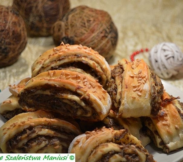 Dzisiaj mam dla was przepis na wspaniałe paszteciki. Przygotowałam je z dość nietypowym farszem, ale zapewniam was, że smakują rewelacyjnie. Nie spodziewałam się, że wyjdą tak dobre w smaku i będą się cieszyły takim zainteresowaniem. Takie paszteciki przygotowałam ostatnio na imprezę w kinie Helios - raz w miesiącu bawimy się na Kinie Kobiet, zdecydowanie polecam wam takie babskie spotkania, jest naprawdę super. Są konkursy, jest zawsze jakiś pyszny poczęstunek, inne atrakcję no i fajny film, naprawdę warto się wybrać.A paszteciki są z białą kaszanką z masarni Zawistowski. Jedliście kiedyś takie paszteciki ?Zapraszam do spróbowania :-)Składniki:- 300 g mąki pszennej- 20 g świeżych drożdży- 1 jajko- 1 żółtko- pół szklanki ciepłego mleka- 1 łyżeczka cukru- 3 łyżki olejufarsz:- 1 cebula czerwona- 450 g białej kaszanki (masarnia Zawistowski)- 1 jajko- sól, pieprz do smaku- białko do posmarowania pasztecikówWykonanie:W ciepłym mleku (max 37 stopni) rozpuszczamy drożdże i dodajemy łyżeczkę cukru, odstawiamy na 15-20 minut do wyrośnięcia. Do miski przesypujemy mąkę, dodajemy roztrzepane widelcem jajko i żółtko oraz olej, na koniec dodajemy wyrośnięty rozczyn drożdżowy. Wyrabiamy ciasto przez kilka minut, przykrywamy miskę ściereczką i zostawiamy do wyrośnięcia na 1,5-2 godziny.Farsz - z kaszanki zdejmujemy osłonkę, kroimy na kawałki i rozdrabniamy widelcem.Cebule kroimy w kostkę i dusimy na patelni, jak już będzie miękka dodajemy kaszankę i chwilkę wszystko razem przesmażamy. Przekładamy farsz do miski i zostawiamy, aby przestygł.Dodajemy jajko i mieszamy, przyprawiamy solą i pieprzem.Wyrośnięte ciasto przekładamy na podsypaną mąką stolnicę, dzielimy je na pół. Rozwałkowujemy każdą część na owalny prostokątny placek, rozsmarowujemy farsz i zwijamy jak roladę dość ściśle.Kroimy na małe kawałki, układamy je na blaszce wyłożonej papierem do pieczenia (tej dużej z piekarnika) i przykrywamy jeszcze ściereczką na 30 minut, niech podrosną.Paszteciki smarujemy rozbełtanym białkiem co nam zostało i wstawiamy do nagrzanego piekarnika do 180 stopni, grzanie góra-dół, pieczemy przez 25-30 minut, aż nam się ładnie zarumienią. Upieczone paszteciki od razu podajemy, możemy je wystudzić na kratce i zamrozić lub schować do lodówki na potem. Jak chcemy je ponownie użyć wystarczy je podgrzać w piekarniku.Farsz możecie przygotować także ze zwykłej kaszanki, jak nie znajdziecie białej.Smacznego.