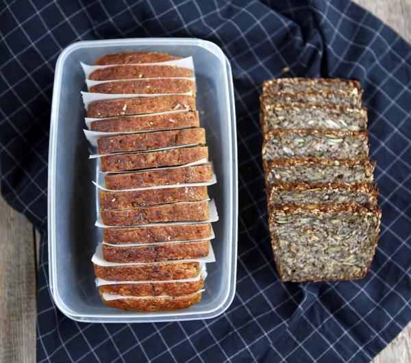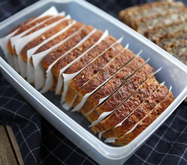 chleb można wyjmować po kromce (poszczególne nie sklejają się ze sobą) i od razu podgrzać albo zrumienić w tosterze. To super prosty sposób, by jeść zawsze pyszny