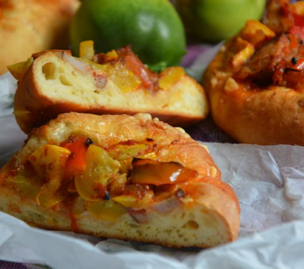 Składniki:Ciasto drożdżowe:500g. mąki pszennej7g. suchych drożdżyszczypta soli1 łyżeczka cukru2 jajka250 ml kwaśnej śmietany200 ml ciepłego mlekaLeczo:300 g cienkiej kiełbasy2 cebule1 papryka1 średniej wielkości cukinia2 dojrzałe pomidory1 łyżeczka suszonej bazylii1 łyżeczka słodkiej papryki w proszku1/2 łyżeczki ostrej papryki w proszkusól , pieprz2 łyżki masła klarowanegoDodatkowo:100-150 g tartego sera żółtegoPrzygotowanie:Ciasto drożdżowe: Mąkę wymieszać z drożdżami , solą i cukrem.Wbić jajka , dodać śmietanę i mleko.Wyrobić odchodzące od doni ciasto.Odstawić na 1 godz w ciepłe miejsce do podwojenia objętości.Leczo:Warzywa umyć , osuszyć.Kiełbasę pokroić w pół plastry ,obraną cebulę posiekać drobno.Pomidory obrać ze skórki ( lub zostawić) wraz z papryką i cukinią pokroić w kostkę.Na patelni rozgrzać masło klarowane , zeszklić cebulę , zrumienić kiełbasę.Dodać paprykę z cukinią i pomidorami.Dusić do miękkości warzyw.Doprawić suszoną bazylią , papryką solą i pieprzem.Ciasto drożdżowe podzielić na kawałki w zależności ile drożdżówek chcemy otrzymać – u mnie 5 bardzo dużych.Z każdego kawałka zrobić kulkę , ułożyć na blaszce wyłożonej papierem do pieczenia , spłaszczyć .Ciasto pozostawić na kolejne 15 min, w każdej bułce zrobić wgłębienie pozostawiając pulchne ranty , posypać obficie serem żółtym.Wgłębienia wypełnić leczo.Piec 20-25 min w piekarniku nagrzanym do 200 st.