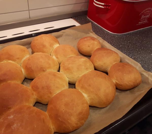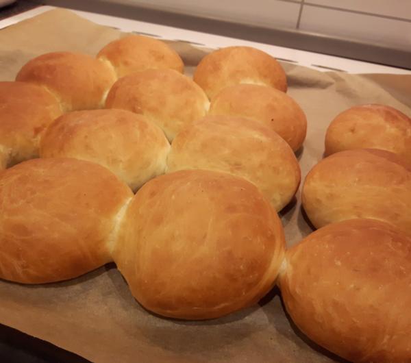 WykonanieMąkę przesiewamy do większej miski, dodajemy sól. Na środku mąki robimy dołek, do którego dodajemy pokruszone drożdże, wlewamy lekko ciepłe mleko , * mleko nie może być gorące bo zabije właściwości drożdży* posypujemy drożdże cukrem. Całość przypruszamy nieco mąką. Pozostawimy na ok. 10 minut.Następnie dodajemy oliwę lub stopione i roztrzepane 2 jajka . Mieszamy wszystko drewnianą łyżka a następnie przekładamy na stół i wyrabiamy ciasto ok 15 minut. Ciasto będzie jeszcze nieco lepkie , dlatego podsypujemy je stopniowo odrobiną mąki aż do czasu kiedy już nie będzie nam się kleiło .Pozostawiamy do wyrośnięcia przykryte ściereczką w ciepłym miejscu na min 30 min lub dłużej.Po tym czasie ponownie zagniatamy ciasto ale już nieco krócej, ok. 5 minut.Tniemy ciasto na kawałki i formujemy kulki, ugniatając je na stole, tak aby każdą bułkę troszkę wyrobić . Układamy z odstępami na blaszce do pieczenia wyłożoną papierem do pieczenia.Przykrywamy ściereczką i odstawiamy bułki do wyrośnięcia w ciepłe miejsce na 30 min. Ja często kładę blachę na kuchence i zapalam kilka palników na stopień nr 1, to bardzo pomaga i bułki bardzo ładnie wyrastają , zwłaszcza zimą.Następnie pieczemy bułki w nagrzanym piekarniku od 10 do 13 min. w temp 180 St. aż będą ładnie rumiane.Jeśli chcemy aby bułki były świecące na wierzchu należy je przed włożeniem do piekarnika posmarować roztrzepanym jajkiem.