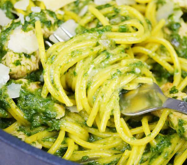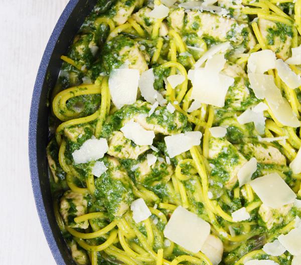 Makaron w gęstym, szpinakowym sosie z nutą parmezanu i kawałkami kurczaka to świetny pomysł na szybki obiad. Jest sycący, pyszny i naprawdę prosty do wykonania. Baza sosu to beszamel – sos z mleka i zasmażki, który może być początkiem wszystkich białych sosów, a także idealnym dodatkiem do zapiekania, warto mieć go w swoim repertuarze! Oczywiście, można pominąć kawałki kurczaka, a klasyczny parmezan zastąpić parmezanem z kruszonych migdałów, czyli jego wegańskim zamiennikiem.Składniki► makaron suchy (u mnie kukurydziany) [300 g]► masło/olej kokosowy [30 g / 3 łyżki]► mąka (pszenna, kukurydziana, ryżowa, jaglana) [2 łyżki]► mleko (dowolne) [500 ml / 2 szklanki]► szpinak mrożony [450 g / 1 paczka]► pierś z kurczaka [500 g]► parmezan tarty [3 łyżki]Dodatkowo► sól [do smaku]► czosnek granulowany [łyżeczka]► pieprz mielony [1/2 łyżeczki]PrzygotowaniePierś z kurczaka oczyścić i pokroić w kostkę, oprószyć pieprzem solą i czosnkiem i podsmażyć na łyżce oleju/masła na złoty kolor.Makaron ugotować zgodnie z instrukcjami na opakowaniu.Przełożyć kurczaka na talerz i na tej samej patelni rozpuścić 2 łyżki oleju lub masła.Kiedy tłuszcz się roztopi, dodać 2 łyżki mąki i mieszać, aż mąka straci surowość.Stopniowo dolewać mleka i mieszać cały czas, aby nie utworzyły się grudki.Cały sos zredukować, aż nie stanie się gęsty i kremowy.Do sosu dodać przesmażonego kurczaka, rozmrożony i odciśnięty z wody szpinak i parmezan. Wymieszać porządnie i doprawić solą do smaku.Sos wymieszać z makaronem i podawać na gorąco.Smacznego!