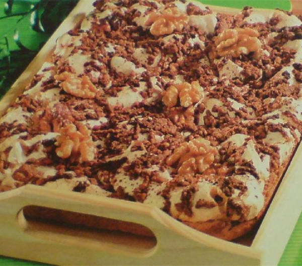 Dodaj przepis do ulubionych!(ilość porcji): 10(z pieczeniem / smażeniem): 90 minut(stopień trudności):Oceń przepisMożesz ocenić ten przepis nie rejestrując się u nas!Średnia ocena użytkowników : 5Ilość ocen : 1SkładnikLogo Ilość Czegomąka 2 szklanekmargaryna 1 sztukżółtka 2 sztuksól 1 szczyptacukier 1 szklanekbiałka 4 sztukdżem z czarnej porzeczki 1 sztukrum 4 łyżek stołowychkakao 2 łyżek stołowychorzechy włoskie według uznaniaWykonanie:Przesianą mąkę posiekać z margaryną, dodać żółtka, sól oraz połowę cukru i szybko zagnieść ciasto. Owinąć folią i wstawić na 30 minut do lodówki. Następnie ciasto podzielić na 3 części. Jedną rozwałkować i wyłożyć nią natłuszczona formę. Posmarować dżemem wymieszanym z alkoholem. Drugą część zetrzeć na tarce o grubych oczkach bezpośrednio na warstwę dżemu.Z białek i pozostałego cukru ubić sztywną pianę i równomiernie rozłożyć na cieście. Ostatnią część ciasta zagnieść z kakao i zetrzeć na tarce na warstwę piany. Udekorować połówkami orzechów i piec ok. 45 minut w 180 stopniach.Autor: BeciaZobacz inne przepisy użykownika!Ciasta i DeseryKuchnia PolskaWielkanocDodaj komentarz:Jeśli chcesz dodać link do tego przepisu na swoją stronę, to wystarczy, że skopiujesz kod poniżej z pola tekstowego i wkleisz go na swoją stronę czy bloga: