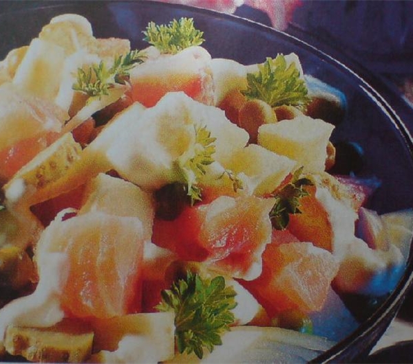 Dodaj przepis do ulubionych!(ilość porcji): 2(z pieczeniem / smażeniem): 30 minut(stopień trudności):Oceń przepisMożesz ocenić ten przepis nie rejestrując się u nas!Średnia ocena użytkowników : 4Ilość ocen : 2SkładnikLogo Ilość Czegołosoś wędzony 150 gramówogórki konserwowe 2 - 3 sztukcebula 1 sztukziemniaki 3 sztukgroszek konserwowy 0,5 sztukkapary 2 łyżek stołowychmajonez 3 łyżek stołowychjogurt naturalny 3 łyżek stołowychcukier według uznaniapieprz według uznaniasól według uznaniaWykonanie:Łososia pokroić w dość drobną kostkę, a obrane ze skórki ziemniaki w nieco większą kostkę, cebulę w piórka, ogórki w półplasterki. Rozdrobnione składniki sałatki dokładnie wymieszać, dodając opłukane kapary, osaczony groszek i na końcu sos przyrządzony z majonezu i jogurtu. Doprawić do smaku cukrem, solą, pieprzem i starannie wymieszać.Uwagi:Ziemniaki gotujemy w mundurkach.Autor: BeciaZobacz inne przepisy użykownika!Kuchnia PolskaPotrawy z RybSałatkiDodaj komentarz:Jeśli chcesz dodać link do tego przepisu na swoją stronę, to wystarczy, że skopiujesz kod poniżej z pola tekstowego i wkleisz go na swoją stronę czy bloga: