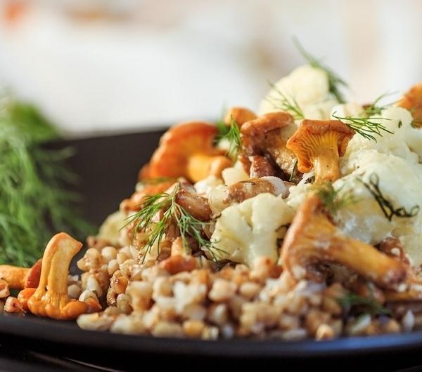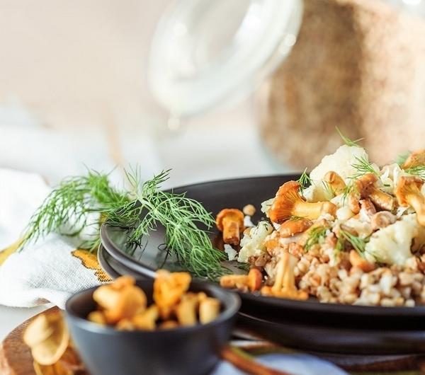 przepis na 2 porcjeBezglutenowyZawiera:Nabiał1. Kurki delikatnie oczyść pędzelkiem do grzybów (nie polecam mycia w wodzie). 2. Kalafior podziel na mniejsze różyczki i dodaj do gotującej się, osolonej wody. Gotuj 5 minut, a następnie ostrożnie odsącz do durszlaka. 3. Na patelni rozgrzej olej i dodaj pokrojnoną w kosteczkę cebulę. 4. Kiedy zacznie się szklić, wrzuć oczyszczone kurki oraz łyżkę masła. Wymieszaj i smaż 7–8 minut na średnim ogniu 5. Tymczasem posiekaj połowę przygotowanego koperku. 6. Zmniejsz ogień i dodaj ugotowany kalafior, posiekany koperek oraz śmietanę. Podgrzewaj nie przerywając mieszania, aż sos się zagotuje i gotuj dodatkową 1 minutę. 7. Zdejmij z ognia. Dopraw solą i pieprzem. 8. Podawaj z ugotowaną kaszą, posypane startym serem i świeżym koperkiem.Zagotuj wodę w garnuszku, dodając do niej 2 suszone grzybki. Kaszę przed ugotowaniem dokładnie przejrzyj czy nie zawieruszyły się inne (nieporządane) ziarna. Opłucz ją pod bieżącą wodą na sitku i dodaj do gotującej się wody. Gotuj ok. 15 minut na małym ogniu, aż kasza wchłonie całą wodę.